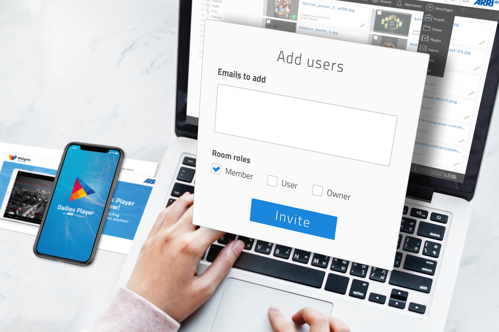 Also, we have simplified the add users dialog. If you are in a certain room in ARRI Webgate, you will first be offered this room for assigning rights. From now on, it is sufficient to enter the user's e-mail address, and the user then enters his personal data when the password is assigned. A handy new feature is the ability to add a comma-separated list to the "Add User" dialog, inviting many users in one step.