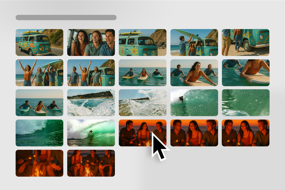 In this view, playlist borders disappear and you’ll see all video thumbnails in a given room directly next to and below each other. Hovering over a clip reveals additional info like scene and take, and a single click opens the video in the preview player.